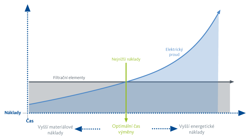 Při filtraci částic ze stlačeného vzduchu se objem dutiny ve filtračním elementu stále více zmenšuje, v důsledku čehož se neustále zvyšuje tlakový rozdíl mezi vstupem a výstupem z filtru. Aby se tento rozdíl vyrovnal, musí kompresor vytvářet vyšší tlak. K tomu je zapotřebí dodatečná elektrická energie, což způsobuje vyšší provozní náklady. Filtrační element by proto měl být vyměněn nejpozději tehdy, když dodatečné náklady na energii (nebo provozní náklady) překročí pořizovací náklady na nový element.