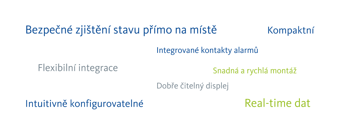 Pokud se u modelu UD02 spustí alarm, rozsvítí se příslušné LED diody vedle digitálního displeje a aktivují se příslušné spínací kontakty. Do rozsahu dodávky patří různé štítky s jednotkami.