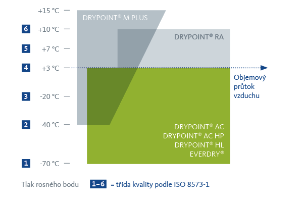 V podobě DRYPOINT AC nabízíme adsorpční sušičky s regenerací za studena, řada EVERDRY pak představuje adsorpční sušičky s teplou regenerací. Obě řady jsou vhodné pro vysoké požadavky na kvalitu, při kterých je nutno dosáhnout velmi nízkého tlakového rosného bodu nebo pro velmi velké objemové průtoky.