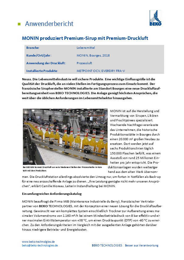 Die Lebensmittelindustrie will sichere Produkte. Ein wichtiger Einflussfaktor ist die Qualität der Druckluft, die an vielen Stellen im Herstellungsprozess eingesetzt wird. Der französische Siruphersteller MONIN hat am Standort Bourges eine neue Druckluftaufbereitungsanlage von BEKO TECHNOLOGIES installiert. Die Anlage erfüllt höchste Standards, die weit über die üblichen Anforderungen im Lebensmittelbereich hinausgehen.