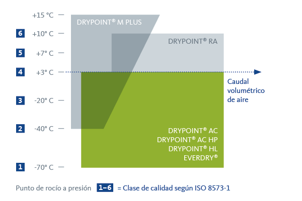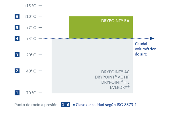 La humedad en forma de condensado representa en las redes de aire comprimido un peligro permanente para el proceso de servicio. Nuestros secadores de aire comprimido DRYPOINT y EVERDRY le ofrecen ventajas considerables con una seguridad de servicio notablemente aumentada - y van aún un paso más allá: Gracias al enorme potencial de ahorro de energía también protegen los recursos financieros que usted puede necesitar para su negocio principal. Otro criterio para la selección de un secador de aire comprimido es el grado de secado deseado, el caudal de aire y la clase de calidad. En este contexto, se distinguen tres procesos de secado del aire comprimido.