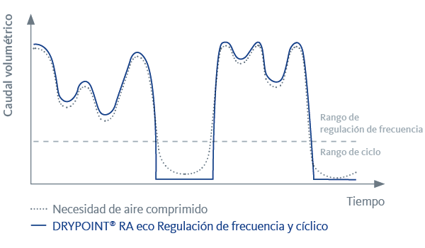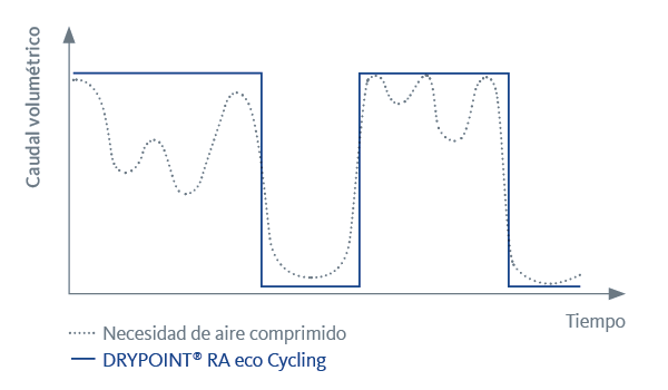 Para caudales volumétricos inferiores a 1.000 m³/h el DRYPOINT RA eco trabaja como secador cíclico, en el que el compresor de agente frigorífico se desconecta controlado por la necesidad. El sistema cíclico inteligente se lleva a cabo en función de la necesidad de secado y se regula de forma que los tiempos de desconexión se prolongan de forma óptima.