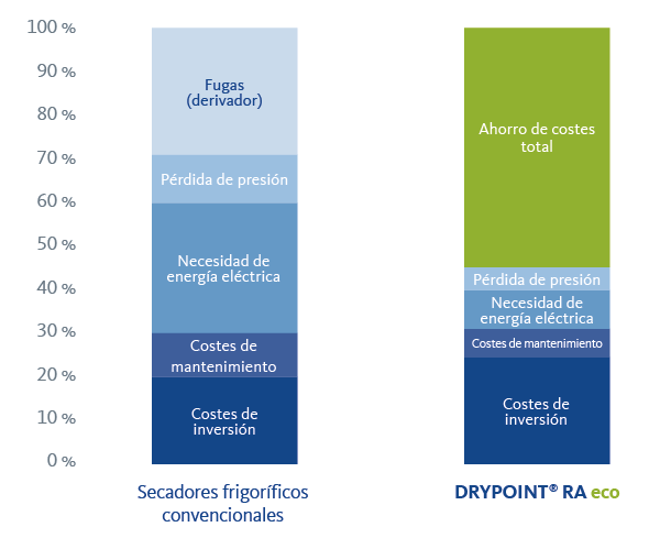 El mayor ahorro radica en la energía que no consumimos.  A menudo, los secadores frigoríficos se diseñan para las condiciones de aplicación más severas: el criterio es el servicio en verano, con altas temperaturas. Por tanto, la mayor parte del tiempo el secador está sobredimensionado y rara vez funciona a plena carga. El secador frigorífico DRYPOINT RA eco la cantidad de energía consumida se adapta al rendimiento de secado requerido, este proceso ahorra hasta un 55 % de ahorro de costes en los 5 primeros años de servicio.