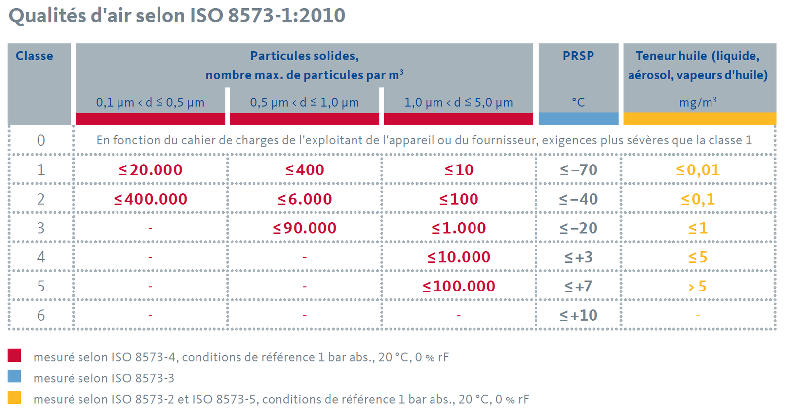 Pour exprimer un certain niveau de qualité de l'air comprimé selon ISO 8573.1, la norme utilise trois chiffres, représentés entre crochets et séparés par des doubles points, par exemple [1:2:3]. Ces trois chiffres correspondent aux trois facteurs fondamentaux. Le premier chiffre exprime la contamination en particules (poussières et impuretés diverses), le deuxième définit la teneur en eau et en vapeur d'eau et le troisième chiffre, la teneur résiduelle en huile et en vapeurs d'huile. Le gonflage de pneus, par exemple, requiert la classe de qualité 2, aussi bien pour la concentration en particules que pour la concentration en huile, alors que la mise en peinture à l'aide de pistolets ou la découpe au laser exigent la classe 1, pour la teneur en particules et la teneur en huile. Alors que les applications courantes utilisant de l'air comprimé d'usine ou d'exploitation se contentent d'une classe 4, les processus plus complexes requièrent quant à eux un taux d'humidité correspondant à la classe 2 voire même la classe 1.