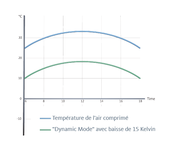 Dans le "Dynamic Mode", le point de rosée sous pression à la sortie est abaissé d'une différence stable, choisie par l'utilisateur entre 10 et 55 Kelvin, par rapport à la température de l'air comprimé. Si la température à l'entrée change, le point de rosée sous pression s'adapte automatiquement. Cela se traduit par une sécurité totale car même en cas de variation de la température de l'air comprimé, le degré de séchage approprié est toujours respecté.