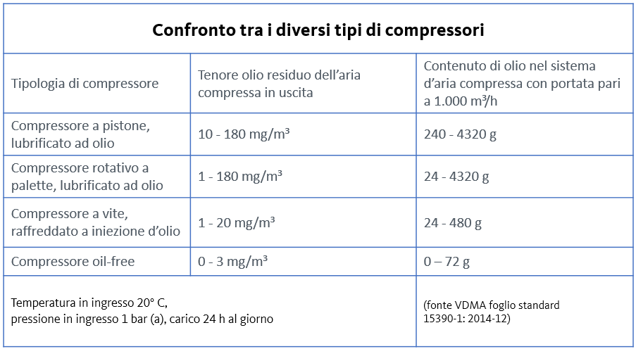Certo è che un compressore non lubrificato non aggiunge ulteriore olio all’aria compressa. Tuttavia, come visto sopra, i contaminanti (come i gas di scarico dei veicoli o dei sistemi di riscaldamento, i vapori d’olio e i microorganismi) sono già presenti nell'aria di aspirazione e, dopo la compressione, la loro concentrazione risulta maggiore. Il contenuto di olio è spesso pari o superiore a 0,01 mg per metro cubo (classe 2 o anche peggiore secondo ISO 8573-1). Per questo motivo, l’aria compressa deve sempre essere trattata, anche in presenza di un compressore oil-free.
