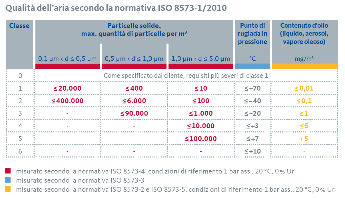 La serie di norme DIN ISO 8573 tratta la qualità dell’aria compressa in nove sezioni. Le sezioni da due a nove comprendono i metodi di prova. Nella prima parte, la norma classifica l’aria compressa in base alla quantità di impurità (particelle solide, acqua e olio) contenute nell'aria. La norma DIN ISO 8573-1 definisce le classi di qualità dell’aria compressa secondo:
