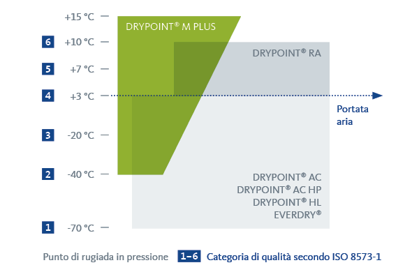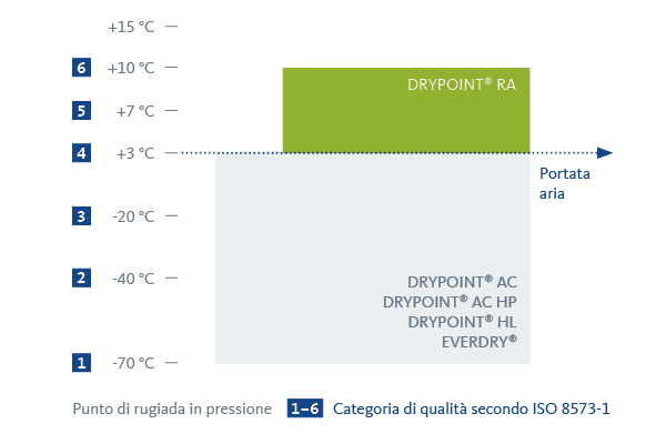 La nostra ampia gamma di prodotti, quali essiccatori a ciclo frigorifero, a membrana e ad adsorbimento, ci permette di soddisfare in modo ottimale tutte le richieste. Le nostre soluzioni prevedono una vasta selezione sia di classi di qualità, sia di gradi di essiccazione, con la possibilità di scegliere il punto di rugiada in pressione tra +15 °C e -70 °C. Per trovare il sistema adatto a voi, applichiamo ai nostri servizi di consulenza gli stessi parametri elevati che caratterizzano i nostri prodotti: sostenibili, a lungo termine, personalizzati.