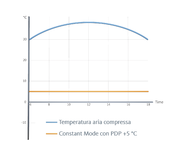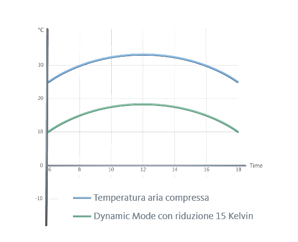 In "Modalità Dinamica", il punto di rugiada in pressione diminuisce di una differenza determinata fra 10 e 55 kelvin rispetto alla temperatura dell’aria compressa. Nel caso in cui la temperatura d’entrata cambi, il punto di rugiada in pressione si adatta automaticamente. In tal modo si garantisce il mantenimento del giusto grado di essiccamento anche in presenza di temperature dell'aria compressa variabili.