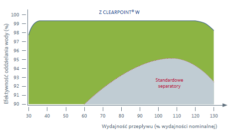 Dzięki optymalizacji strumienia CLEARPOINT W uzyskuje efektywność nawet do 99% separacji „swobodnej” wody w szerokim zakresie wydajności – w celu uzyskania najwyższego stopnia separacji przy najniższym koszcie.