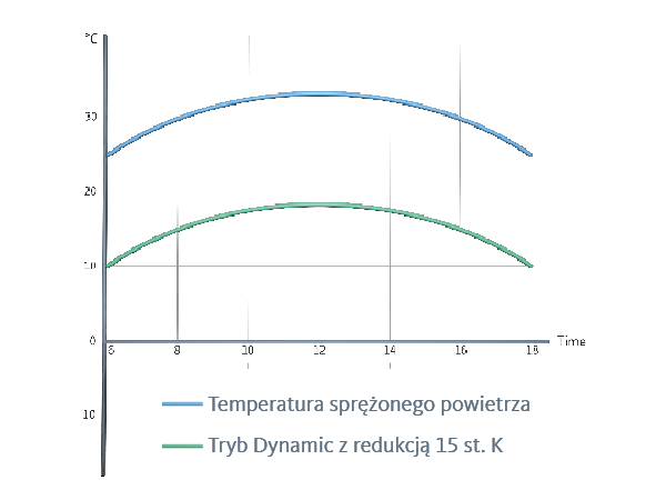 W dynamicznym trybie pracy „Dynamic Mode” następuje obniżenie ciśnieniowego punktu rosy o ustaloną różnicę zawierającą się w przedziale od 10 do 55 kelwinów w stosunku do temperatury sprężonego powietrza. Gdy zmienia się temperatura na wejściu, automatycznie zmienia się ciśnieniowy punkt rosy. Gwarantuje to nawet przy zmieniających się temperaturach sprężonego powietrza zachowanie zawsze prawidłowego stopnia osuszania.