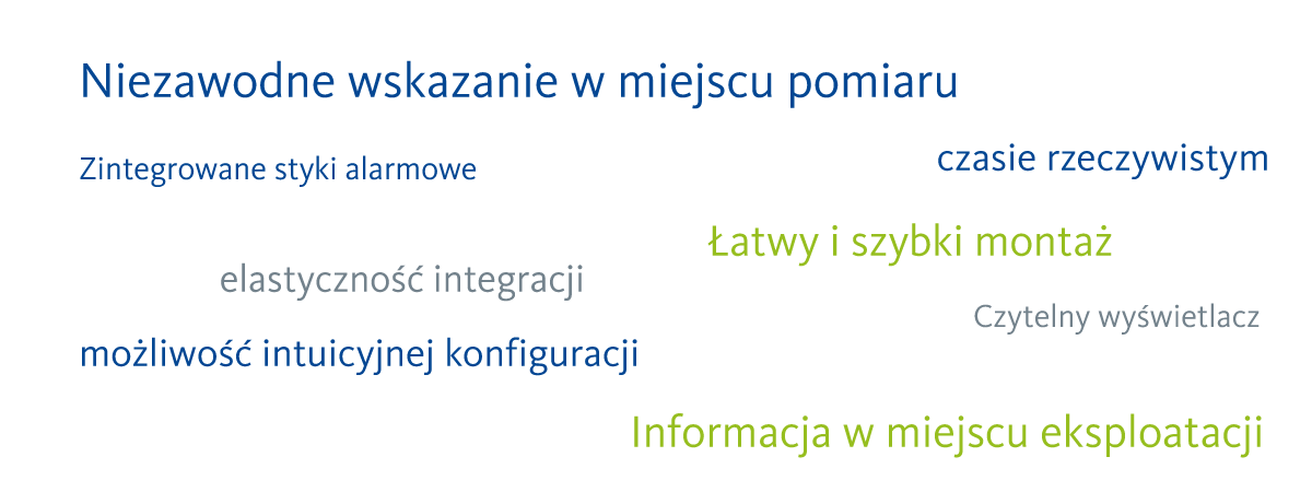 Wyświetlacze przyłączalne są przystosowane do użytku ze wszystkimi przetwornikami pomiarowymi wyposażonymi w wyjście analogowe 4 ... 20 mA / 2-przewodowe. Można je łatwo programować z poziomu menu obsługiwanego dwoma przyciskami. Ustawienia użytkownika (zakres pomiarowy, wartości alarmowe) pozostają zachowane również w przypadku awarii zasilania lub przełożenia na inne czujniki. Przekroczenie zakresu w obu kierunkach sygnalizowane jest optycznie (LED) oraz jako wartość 4-20 mA w urządzeniu UD02.
