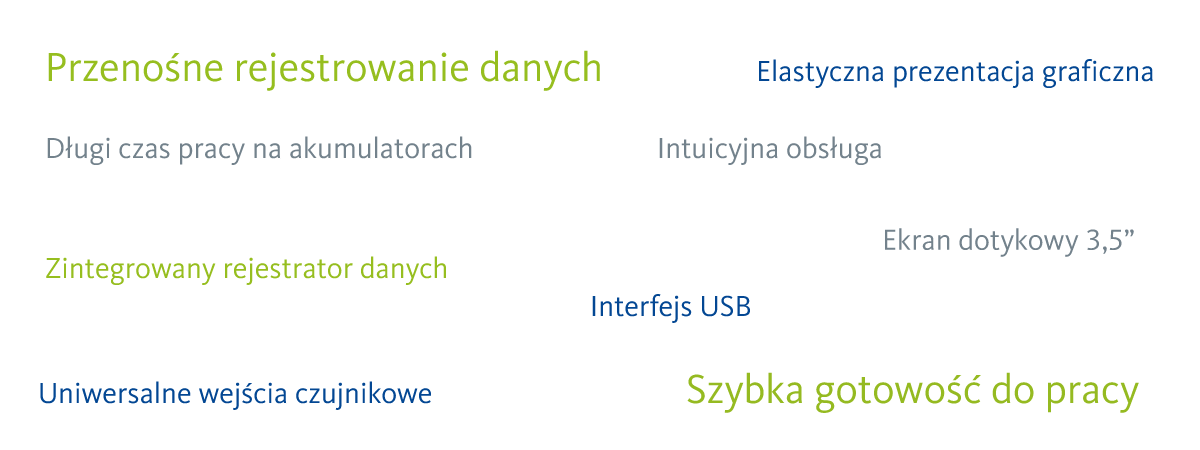 Uniwersalne wejście czujnikowe zapewnia możliwość podłączenia wszystkich typowych w przemyśle przetworników pomiarowych. Intuicyjna obsługa odbywa się na czytelnym ekranie dotykowym 3,5". Rejestrowanie danych przydatnych w serwisowaniu przez zintegrowany rejestrator danych, barwne prezentacje z krzywymi pomiarowymi oraz interpretacja danych to kolejne przekonujące cechy tego wydajnego, a mimo to kompaktowego miernika. Za pomocą pamięci USB wartości pomiarowe można również wygodnie przenosić do komputera PC i tam w nieskomplikowany sposób poddawać dalszej analizie w oprogramowaniu analizującym METPOINT READER SW201. W ten sposób zmierzone wartości można łatwo odtworzyć w czasie rzeczywistym, a w razie potrzeby natychmiast podjąć niezbędne działania. Dzięki urządzeniu METPOINT BDL portable przez cały czas można obserwować i kontrolować wszystkie wartości również na miejscu.