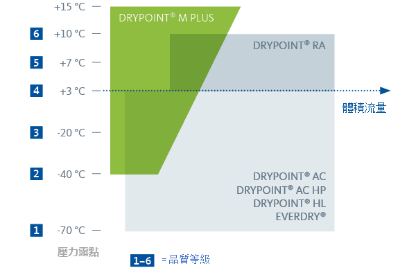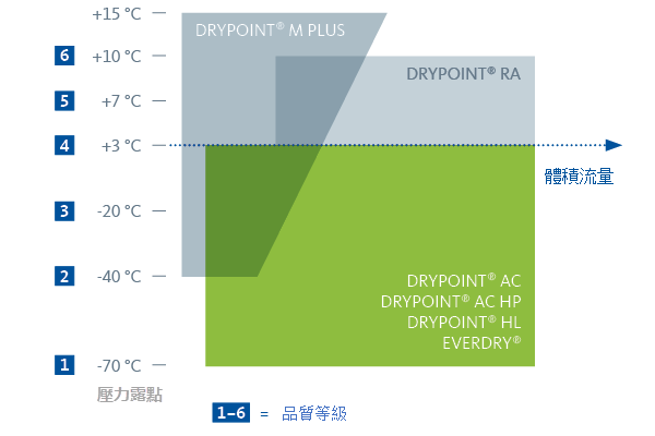 冷凝液的濕氣會持續導致壓縮空氣系統操作過程有危險。我們的DRYPOINT和EVERDRY壓縮空氣乾燥機不但能為您大幅增進製程的安全性,其優勢也絕非僅止於此:乾燥機顯著的節能潛力能節省財務資源,幫助您將資源有效用於核心業務。選擇壓縮空氣乾燥機的重要標準是所需的乾燥度、空氣體積流量和品質等級。因此,三種壓縮空氣的乾燥方式有所區隔。
