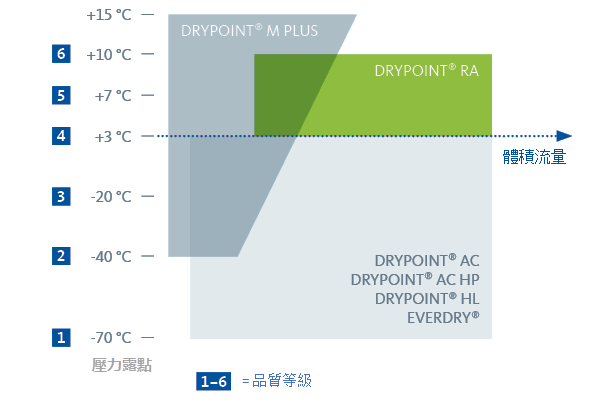 吸附式乾燥機根據吸附原理運作,即空氣以一定的時間通過裝有乾燥劑的容器,而另一個容器的乾燥劑同時間處於再生狀態。DRYPOINT AC運用冷凍再生的原則,而EVERDRY則是加熱再生吸附式乾燥機。兩個系列均能滿足極低的壓力露點或極高體積流量對品質的嚴格要求,而且這種乾燥壓縮空氣的方法可使壓力露點降低至-70°C。